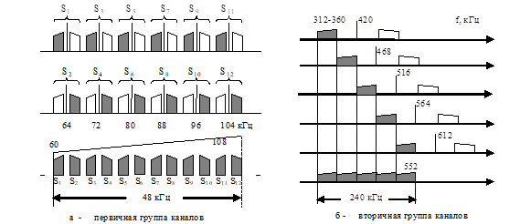 Сигнал одного источника занимает полосу 3,4 кГц. Шесть несущих частот от 64 до 104 кГц отведены для 12-ти источников. Из сигналов от двух источников с одной несущей частотой выделяется нижняя боковая полоса у одного источника и верхняя у другого. В результате суммирования однополосных сигналов 12-ти источников формируется первичная группа каналов. Из пяти первичных групп формируют вторичную группу каналов. Аналогичным образом из пяти вторичных групп формируют третичную группу, из пяти третичных групп - четвертичную группу. Дальнейшее усложнение этой аналоговой системы менее выгодно, чем применение цифровых методов формирования сигналов.