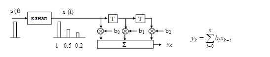 Пусть при передаче, в основной полосе частот, одиночного импульса по многолучевому каналу на выходе демодулятора приемника наблюдается 3 импульса с соотношением амплитуд 1: 0.5: 0.2, следующих через равные интервалы времени Т.