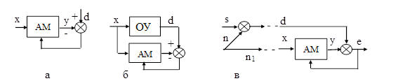При определении характеристик источника сигнала и параметров сигнала, принятого с искажениями и помехами, применяют адаптивные фильтры, моделирующие источник сигнала. Параметры адаптивной модели АМ, возбуждаемой сигналом x, подбираются, чаще всего по критерию минимума СКО выходного сигнала модели y и эталонного сигнала d (а). Структура фильтра-модели, алгоритм подстройки и выбор сигналов x и d зависят от конкретной задачи. Приведем примеры использования адаптивной модели.