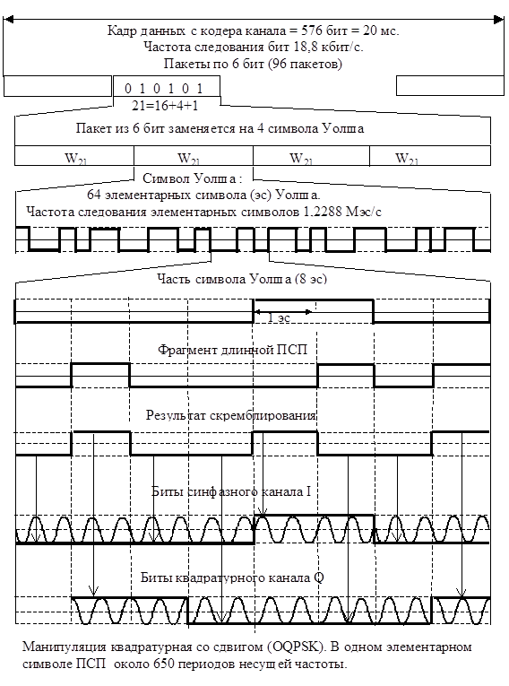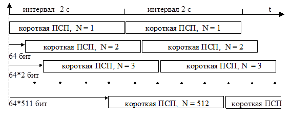 Все BS выдают по пилотному каналу на известной частоте сигнал, модулированный одной и той же короткой ПСП с периодом 2/75с = 32767 бит, т.е. 75 раз в двухсекундном интервале времени. BS с условным номером N генерирует короткую ПСП со сдвигом на 64N бит относительно начала двухсекундного интервала времени: