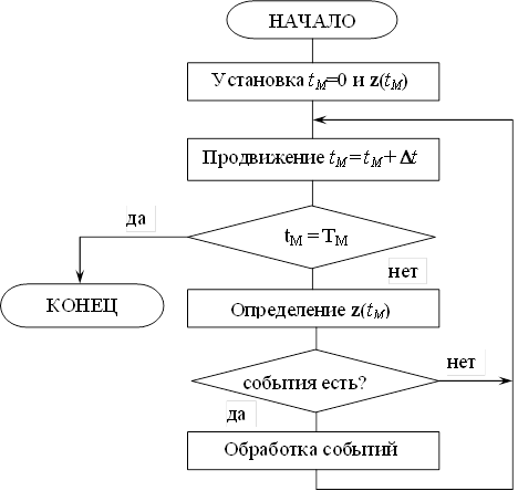 Алгоритм моделирования по принципу постоянного шага приведен на рисунке 1.1. Здесь tМ – текущее значение модельного времени, z(tМ) – состояние системы в этот момент времени, TМ – интервал моделирования.