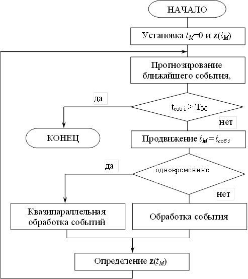 При моделировании по особым состояниям модельное время изменяется от события к событию. События обрабатываются в порядке их наступления, а одновременно наступившими считаются только те, которые являются одновременными в действительности. Алгоритм метода приведен на рисунке 1.2.