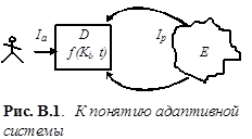 Рассмотрим некоторую активную систему D, взаимодействующую с внешней средой E. Предполагается, что эта система имеет априорную информацию о среде Ia, и в процессе функционирования получает текущую информацию Ip как о внешней среде, так и о собственном состоянии (рис. В.1). Целью системы D является принятие решений, связанных с преобразованием или анализом внешней среды E. В общем случае, информация, имеющаяся в распоряжении системы D, является неполной; в этом случае говорят, что система находится в условиях неопределенности. Тогда под адаптацией будем понимать способность активной системы D достигать заданных целей в условиях неопределенности, на основе использования текущей информации Iр о собственном состоянии и состоянии системы E. При этом в системе D могут изменяться ее параметры Ki, структура и алгоритм функционирования.