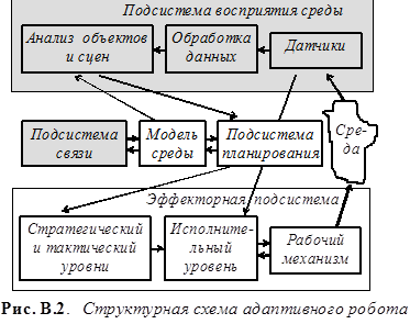В робототехнике информационные системы используются на трех уровнях управления, которые называются также уровнями адаптации: исполнительном, тактическом и стратегическом. В табл. В.1 приведены примеры задач адаптации, решаемых на каждом из этих уровней и используемые для этого информационные средства.