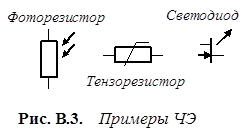 Первичным преобразователем или чувствительным элементом (ЧЭ) называется простейший элемент информационной системы, изменяющий свое состояние под действием внешнего возмущения (фотодиод, тензорезистор). Примеры обозначений ЧЭ, принятых на схемах информационных устройств, приведены на рис. В.3.