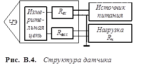 Датчик представляет собой устройство, которое, подвергаясь воздействию физической измеряемой величины, выдает эквивалентный сигнал (обычно электрической природы - заряд, ток, напряжение или импеданс), являющийся однозначной функцией измеряемой величины. В состав простейшего датчика (рис. В.4) входят: один или несколько первичных преобразователей, а также измерительная цепь. Большинство датчиков имеют внешний источник питания, измерительная цепь подключается к нагрузке, в качестве которой может быть использован, например, усилитель, измерительный прибор, блок сопряжения с компьютером и т.п.
