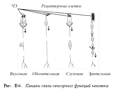 В каждом из этих каналов возбуждение регистрируется системой ЧЭ (рецепторов), специфических для разных модальностей и передается по каналу связи (нервному волокну) в виде потенциалов действий. Система рецепторов каждой модальности связана с определенными отделами центральной нервной системы. На рис. В.6 показан вид каналов связи основных сенсорных модальностей.