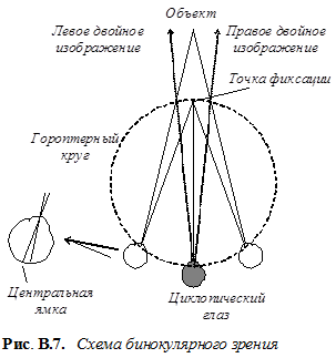Одно время считалось, что механизмы стереоскопии обусловлены исключительно параллаксом, т.е. разностью углов зрения левого и правого глаза. Однако, хотя действительно расстояние одним глазом оценивается менее точно, чем двумя, утрата этой способности не так существенна, как в случае пространственного слуха. В настоящее время полагают, что восприятие глубины пространства зависит также от ряда дополнительных факторов, в том числе зрительного опыта. Изображение объекта проецируется на сетчатку справа от центральной ямки в левом глазу и слева от нее в правом. Это позволяет при бинокулярном зрении создать неперекрещивающиеся двойные изображения. Их наложение осуществляется в так называемом циклопическом глазе, воображаемом органе, в который проецируются сетчатки правого и левого глаза (рис. В.7). Установлено, что изображение не будет двоиться, если объект находится в области гороптера.- криволинейной поверхности, на которой лежат узловые точки обоих глаз и точка фиксации. Бинокулярное зрение у людей не является врожденным и формируется в результате опыта в возрасте 8 … 27 недель