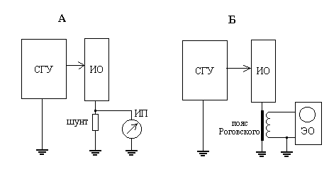 Измерения импульсных токов производится безиндуктивными шунтами и поясами Роговского, представляющими собой катушку, в которой индуктируется полем тока э.д.с., пропорциональная измеряемому току. Схемы включения шунтов и пояса Роговского приведена на рис. 5.