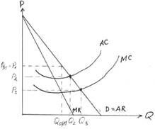 Если взять точку пересечения D и MC (MC=D), получим цену P3. Это общественно-оптимальная цена. Эта цена соответствует наиболее эффективному распределению ресурсов. Но эта ситуация требует дотации государства. Очень часто монополист недогружает свои мощности (Q1).