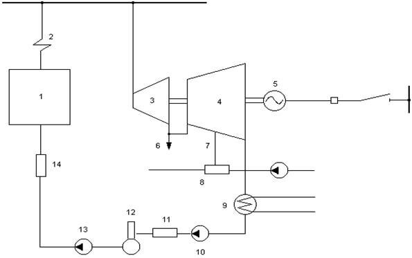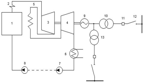 Каждый блок (рис.3) состоит из парогенератора, турбины, электрического генератора и повышающего трансформатора, мощность которого соответствует мощности генератора. Поперечные связи между блоками в электрической части в виде сборных шин генераторного напряжения не нужны, поскольку выдача мощности столь крупных агрегатов в сеть при Uг=20-30кВ практически невозможна; токи КЗ были бы чрезмерно велики. Трансформация напряжения генератора до 110-750кВ и выше является единственно приемлемым решением. Отдельные блоки (генератор-трансформатор) связаны между собой только на сборных шинах высшего или среднего напряжения, откуда мощность станции поступает в энергосистему. Тепловые станции, использующие органические виды топлива (уголь, нефть, газ), выбрасывают в атмосферу окислы серы и азота, а также углекислый газ, который накапливается в верхних слоях атмосферы. В результате с течением времени может произойти потепление на земле, что вызовет повышение уровня мирового океана и затопление прибрежных зон континентов.