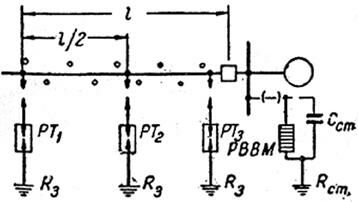 На подходах ВЛ к РУ допускается установка комплекта трубчатых разрядников РТ2. В этом случае R3 определяется как сопротивление параллельно соединенных заземлителей обоих разрядников (РТ1 и РТ2). Для защиты линейного разъединителя или выключателя устанавливается трубчатый разрядник РТ3.