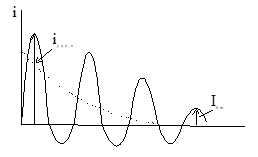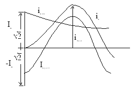 Через p/2 ударный ток в пределе может достигнуть двойной амплитуде установившегося тока, короткого замыкания т.е.