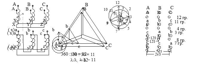 У трансформаторов имеющих одинаковые группы соединения вторичные ЭДС совпадают по фазе. А у трансформаторов с различными группами соединения вторичные ЭДС могут быть равными по величине, однако они всегда сдвинуты по фазе. Поэтому даже при совершенно одинаковых коэффициентах трансформации во вторичных обмотках появится уравнительный ток. Возьмем для примера 12 и 11 группу