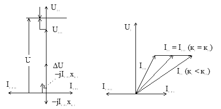 Если возьмем внешние характеристики совместной работы трансформаторов, то увидим, что трансформатор II будет перегружен, т.е. у трансформатора, где Uк больше, там ток меньше, а ток, у которого Uк меньше, возьмет на себя большую нагрузку.