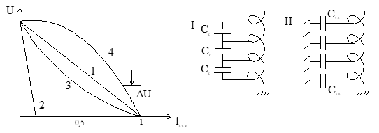 Реально существует одновременно обе емкостные связи и напряжение U находится между этими пределами (3). Здесь на первой виток приходится не все напряжение, а DU, но все же настолько значительное что может произойти пробой. Поэтому у трансформаторов на 35 кв и выше первые катушки выполняются с усиленной изоляцией. Кривая (3) дает распределение напряжения в момент t = 0, установившийся режим (1) . Так как трансформатор состоит как бы из системы C и L соединенных различным образом цепи C и L создают резонансные контура, то переход от начального распределения (3) к установившемуся (1) происходит в результате колебательного процесса. Следовательно после момента времени t = 0(3), наступает момент (4). Видим, что и конечные витки могут быть под повышенным напряжением. В дальнейшем процессе будет затухать за счет активного сопротивления обмоток. Вообще опасность пробоя возможна для любого витка.