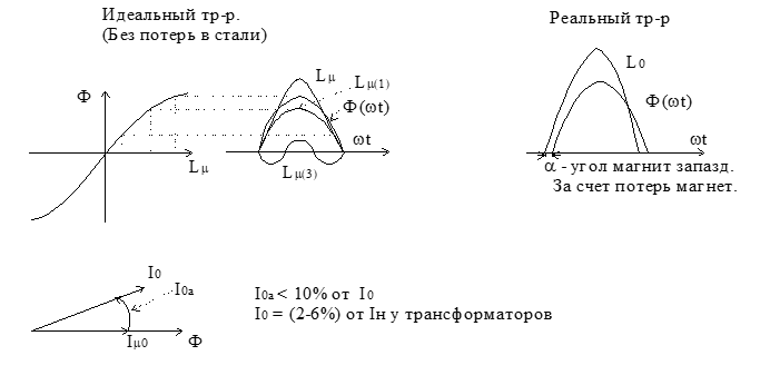 При синусоидальном напряжении и потока, как холостого хода имеет несинусоидальную форму, за счет насыщения железа в области амплитуды потока.