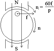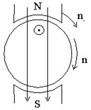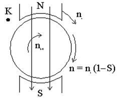 При вращении поля n1 в проводнике ротора наведется ЭДС к нам, правило правой руки. Ток также будет направлен к нам. По правилу левой руки проводник с током попал в магнитное поле на него будет действовать сила f, под действием которой ротор будет вращаться в туже сторону, что и магнитное поле статора.