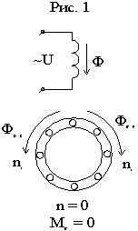 Однофазный асинхронный двигатель по своим рабочим характеристикам уступает 3х фазному. Но он имеет то преимущество, что питается от однофазной сети. У однофазного двигателя в пазах статора укладываются две обмотки сдвинутые в пространстве на 90° эл. градусов. Но вторая (пусковая обмотка) используется только на период пуска, после чего она отключается. Ротор обычно короткозамкнутый. Однофазная обмотка создает пульсирующий магнитный поток, который можно разложить на прямой поток и обратный. При пуске (n = 0) моменты от прямого и обратного потока равны и противоположны. По этому пусковой момент Мп = 0. Если сдвинуть ротор по направлению прямого поля, то ротор разгонится до скорости близкой к скорости поля Фпр.
