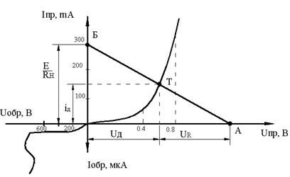 Через эти точки проводим прямую, которая и является линией нагрузки. Координаты т. Т определяют рабочий режим диода.