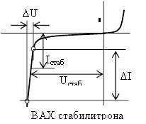 Стабилитроны – полупроводниковые диоды, работающие на обратной ветви ВАХ в области, где изменение напряжения электрического пробоя слабо зависит от значения обратного тока и применяется для стабилизации напряжения.