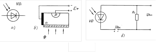 Фотодиоды имеют структуру обычного р-n-перехода (см. рис.), где а) - условное обозначение фотодиода, б) - структура фотодиода. Вследствие оптического возбуждения в р и n областях возникает неравновесная концентрация носителей заряда.