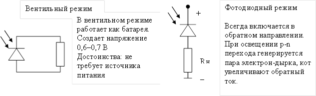 На границе перехода неосновные носители заряда под влиянием электрического поля, перебрасываются через переход в область, где они являются основными носителями. Электрический ток, созданный ими есть полный фототок. Если р-n-переход разомкнут, то перенос носителей заряда, генерируемых светом, приводит к накоплению отрицательного в n-области и положительного в р-области зарядов. Новое равновесное состояние соответствует меньшей высоте потенциального барьера, равной (Uк-Еф). ЭДС Еф, возникающую при этих процессах, на значение которой снижается потенциальный барьер Uк в р-n-переходе, называют фотоэлектродвижущей силой (фото-ЭДС) В данной ситуации фотодиод работает в режиме фотогенератора, преобразуя световую энергию в электрическую.