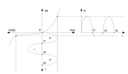 Диоды являются полупроводниковыми приборами, которые пропускают ток  в одном направлении. При прикладывании к диоду прямого напряжения («+» к аноду, а «-» к катоду), резко возрастает значение прямого тока, который во много раз больше обратного  I пр>>Iобр.