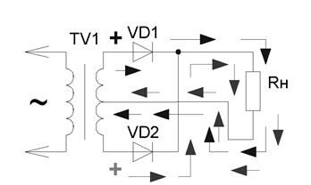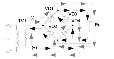 Падение напряжения на отдельном диоде зависит от величины прямого тока Iпр, температуры и составляет для германиевых диодов 0.15-0.4 В, для кремневых 0.5-0.9 В. Обратный ток Iобр, протекающий через диод, сильно зависит от температуры, и при некотором значении Uобр приближается к некоторому постоянному значению (с увеличением температуры происходит увеличение обратного тока).