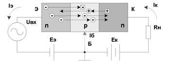 При работе транзистора в активном режиме его эмиттерный переход смещается в прямом, а коллекторный — в обратном направлении (рис.  в).
