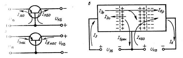 Эмиттерный и коллекторный ЭДП в режиме отсечки (рис.  а) смещаются в обратном, а в режиме насы­щения (рис.  б) — в прямом направлениях. Кол­лекторный ток в этих режимах практически не зависит от напряжения и тока эмиттера.