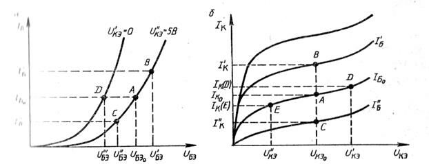Ни рис.  а показано семейство входных характеристик биполярного транзистора типа п- р- п, включенного по схеме ОЭ, которые выражают зависимость IБ =f(UБЭ) при  UКЭ = const.