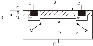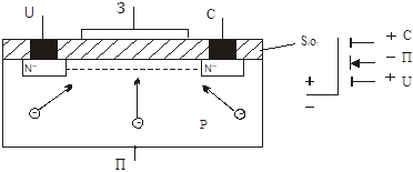 Движение носителей заряда начинается от истока в направлении стока по каналу, ширина которого зависит от напряжения, приложенного к затвору. Соответственно имеет 3 электрода: затвор, сток и исток. р-n переход является высокоомной областью неподвижных носителей заряда –ионов.