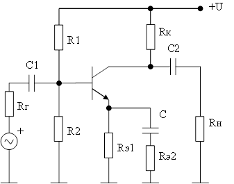 Каскад усиления переменного тока по схеме ОЭ построен на биполярном транзисторе n-p-n. Расчет каскада сводится к выбору точки покоя на статической линии нагрузки, определению величин Rк и RБ по заданным параметрам нагрузки, например, Um вых и Rн, и напряжению источника питания Eк.