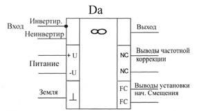 Частотные параметры определяют по АЧХ ОУ, которая имеет спадающий характер в области высокой частоты, начиная от частоты среза. Причиной этого является частотная зависимость параметров транзисторов и паразитных емкостей схемы ОУ. По инвертирующему входу ОУ обычно охватывается ООС. В области высоких частот это приводит к дополнительному (сверх 180˚) фазовому сдвигу, который в пределе может достигать значения в 360˚. Т.о возникает ПОС, что приводит к самовозбуждению схемы. Для устранения самовозбуждения в ОУ вводят внешние корректирующие RC-цепи и места их подключения к микросхеме указываются заводом изготовителем.