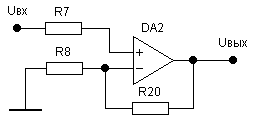 Так как U+≈U-, то Uвх = U-= UR8 (падение напряжения на R8); Uвых = UR8 +UR20 (падение напряжения на R20 и R8). Поскольку входной ток ОУ очень мал, им можно пренебречь, тогда получим Ioc = Uвх/R8= Uвых/(R20+R8). Это означает, что для неинвертирующего усилителя Кu = Uвых/Uвх = 1+R20/R8.