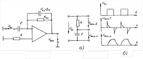 Для интегратора и дифференциатора на инвертирующий вход подаются прямоугольные импульсы с выхода симметричного мультивибратора. На рисунке, а приведен электрический аналог и на рисунке,б временные диаграммы, поясняющие принцип дифференцирования и интегрирования в электрических и электронных цепях.