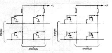 Если соединительный транзистор в данных схемах вы­полнен полностью (без разрыва), то при подаче на соот­ветствующую строку сигнала активного уровня этот транзистор открывается и на столбце, к которому он подключен, появляется логический 0. Если транзистор не подключен к соответствующему столбцу, то активизация соответствующей строки не приводит к закорачиванию столбца и на нем остается логическая 1.