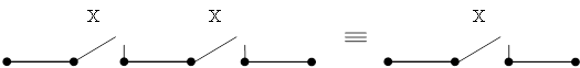 На рис. показана реализация обеих частей выражения  правила повторения с помощью коммутируе­мой цепи. Легко заметить, что рассматри­ваемое тождество выполняется, поскольку два включенных последовательно ключа, замыкание и размыкание которых проис­ходит одновременно, воздействуют на внешние цепи как один такой ключ.
