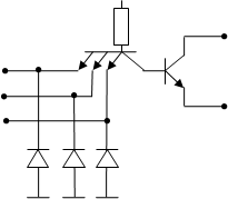 Когда VT3 заперт, схема действует подобно обычному логическому элементу 2И-НЕ, т.к. VD1 смещен в обратном направлении. Если VT3 открыт, VD1 также открыт. U в точке А близко к нулю и VT6 заперт. VT5 также заперт, т.к. на эмиттере VT4, который связан с коллектором VT3, логический ноль. Следовательно, VT7 также заперт, и выходной вывод окажется отсоединенным от входных цепей и обеих шин питания. При этом уменьшается также потребляемая микросхемой мощность.