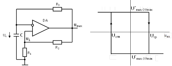 Схема симметричного мультивибратора, выполненного на основе операционного усилителя (ОУ), приведена на рис.3.1,а, а передаточная характеристика ТШ, являющегося частью мультивибратора, приведена на рис.3.1,б.