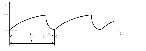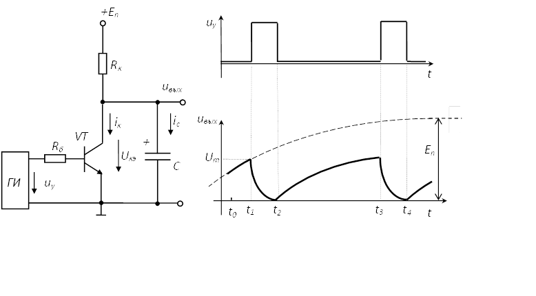 импульс на выходе ГИ заканчивается. Ток базы транзистора VT прекращается и транзистор закрывается. Начинается уже напряжение рассмотренный процесс заряда конденсатора С. Напряжение на конденсаторе С изменяется согласно выражению: