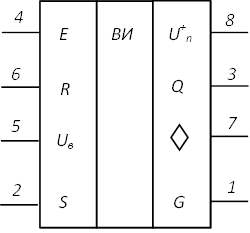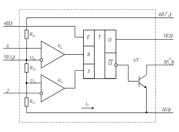 Интегральный таймер – это микросхема предназначенная для построения прецизионных одновибраторов и мультивибраторов. Рассмотрим внутреннюю структуру интегрального таймера и взаимодействие его элементов на примере интегрального таймера КР 1006 ВИ1. Условное графическое обозначение этого таймера на схемах электрических принципиальных показано на рис.3.5, а внутренняя структура – на рис.3.6.
