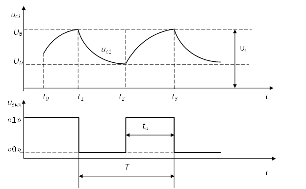 (рис.3.2), сумма которых равна периоду работы мультивибратора Т: