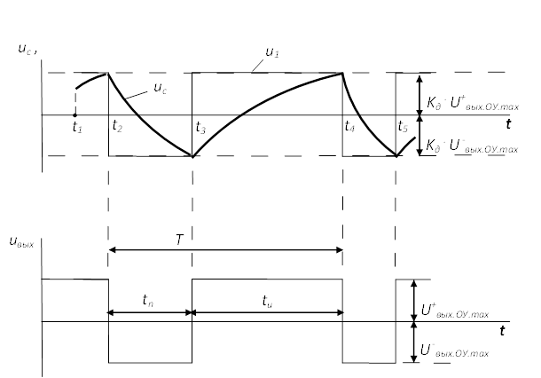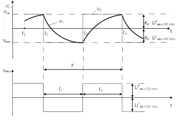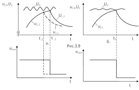 – порога отпускания ТШ, определяемого (3.3). Триггер Шмитта вновь переключается и начинается уже рассмотренный процесс заряда конденсатора С, описываемый (3.2).