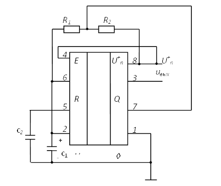 . Делитель подключен между выводами 1 и 8 таймера. Вывод 1 обычно подключается к общему проводу схемы, а на вывод 8 подают напряжение питания