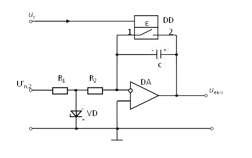 Схема ГЛИН выполненного на основе интегратора, приведена на рис.3.17. В состав схемы ГЛИН входят: операционный усилитель DA, резистор R2 и конденсатор С, включенные по схеме инвертирующего интегратора, резистор R1 и стабилитрон VD, включенные по схеме параметрического стабилизатора, аналоговый ключ DD (специализированная микросхема).