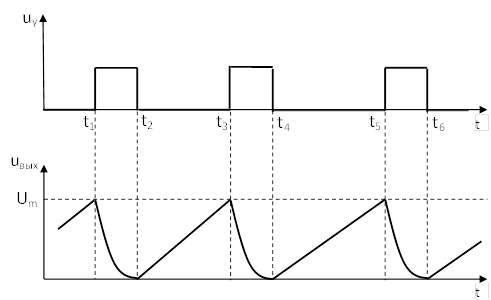 Генераторы линейно изменяющегося напряжения (генераторы пилообразного напряжения) – это устройства, формирующие периодический импульсный сигнал в виде линейно нарастающего (спадающего) напряжения на интервале времени, близком к периоду следования импульсов. Примерный вид линейно изменяющегося напряжения (ЛИН) приведен на временной диаграмме (рис.3.14).