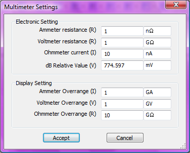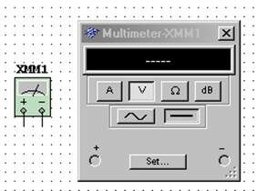 Мультиметр предназначен для измерения переменного или постоянного тока или напряжения, сопротивления или затухания между двумя узлами схемы. Диапазон измерений мультиметра подбирается автоматически. Его внутреннее сопротивление и ток близки к идеальным значениям, но их можно изменить.
