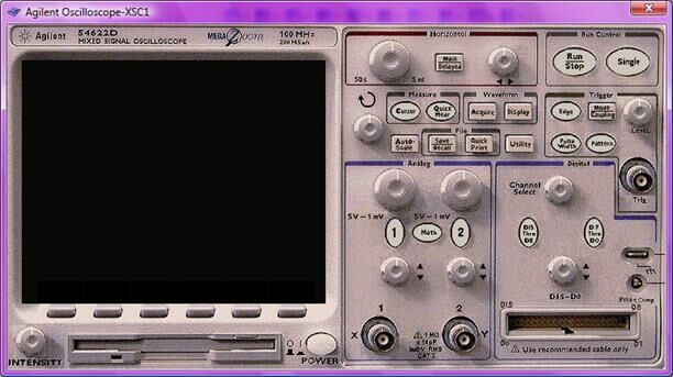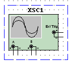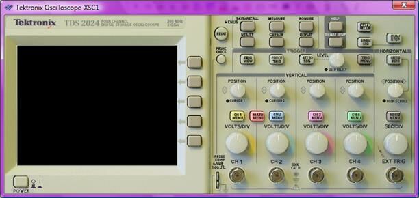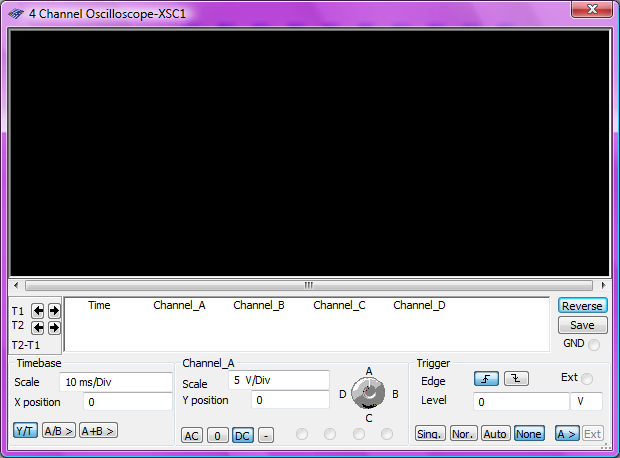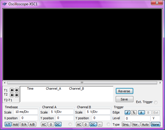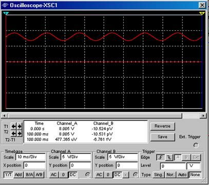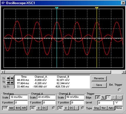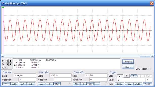 2) Запускаем схему, осциллограф автоматически строит графики зависимости входного и выходного напряжений от времени (для того, чтобы их посмотреть, достаточно нажать левой кнопкой мыши на осциллографе).
